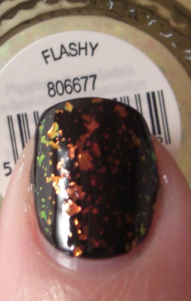 Below are two coats of each flakey topcoat over two coats of Sally Hansen Black Creme and in the same order starting with the thumb. (Asylum-thumb, Flashy-index, Flecked-middle, Motley-Ring, Twisted-pinky)