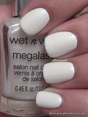 Wet N Wild's Megalast in Break the Ice is a beautiful white polish with silver shimmer. Can a color be be described as graceful? I have a friend who believes there are certain colors you wear on your toes (brights or glitters) and certain colors you wear on your hands (nude cremes and soft shimmers). She approves this one for hands and for work!
